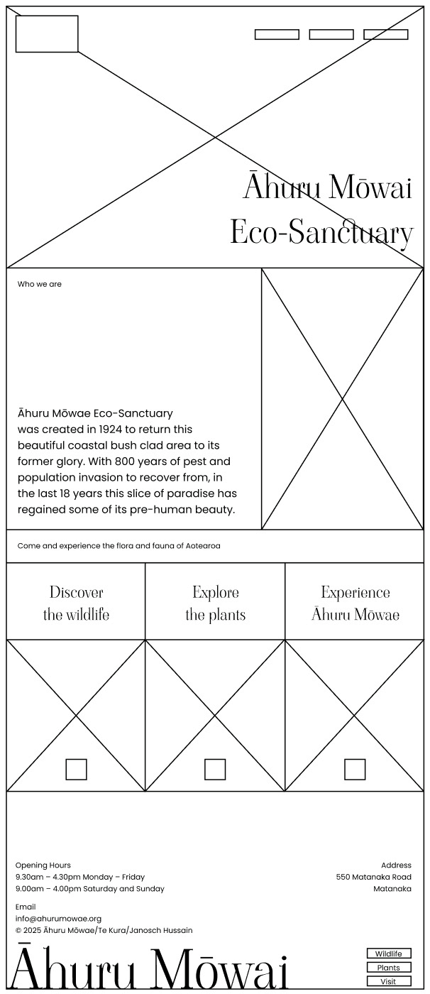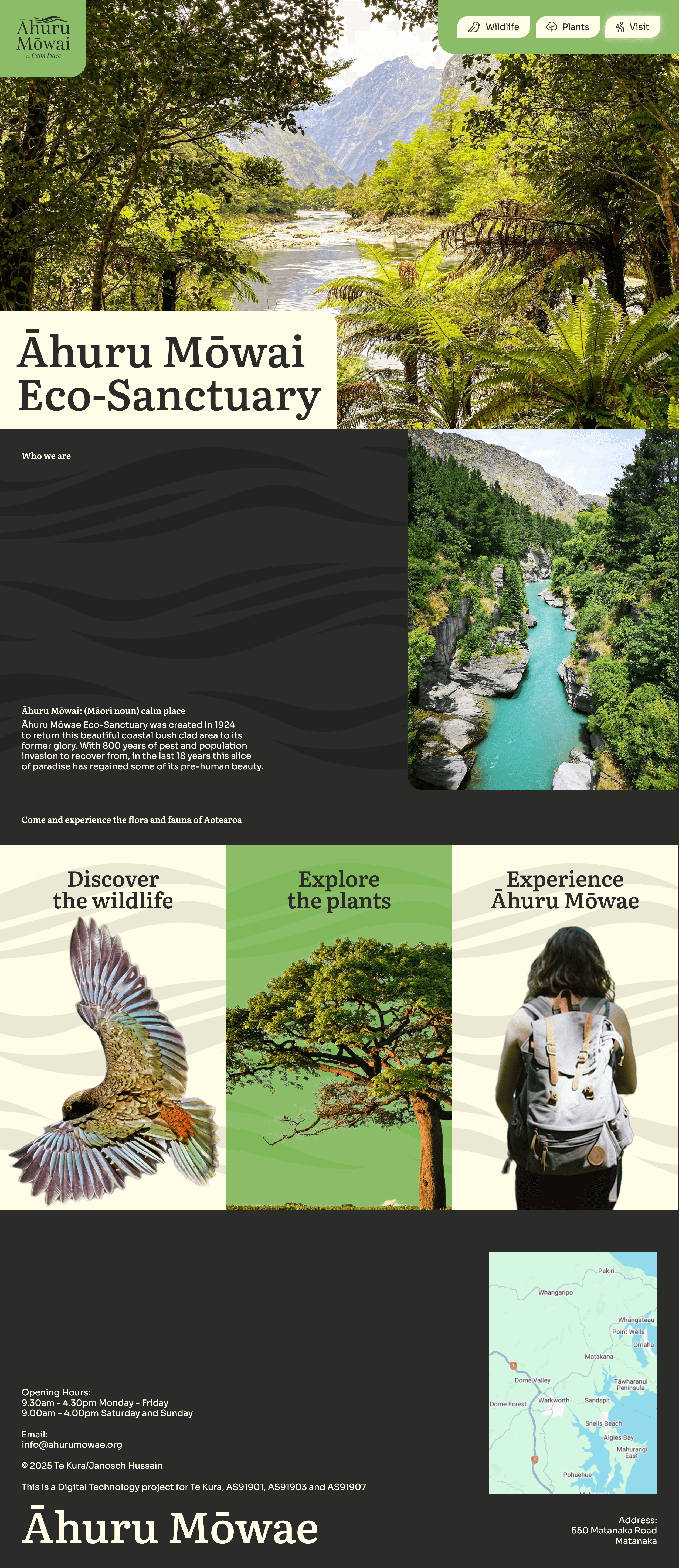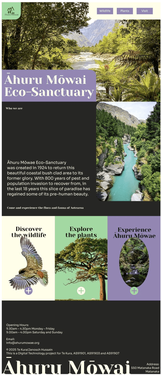 The challenge was designing and building a complete website for a New Zealand eco-sanctuary. I explored multiple design directions, all while maintaining environmental values and web conventions. Through exploring various design concepts emphasising a natural feel, I built a custom website showcasing the sanctuary’s mission and visitor information. The outcome was a comprehensive digital presence that communicates the sanctuary’s environmental mission.